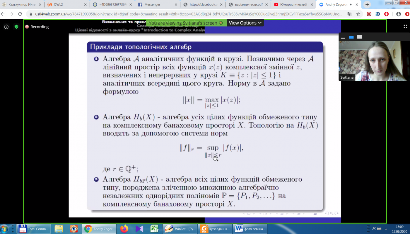 10, 11 та 17 червня на кафедрі математичного і функціонального аналізу відбулись семінари, де аспіранти 2-го року навчання доповіли про підсумки вивчення курсу “Стохастичний аналіз”, а аспіранти 1-го року навчання доповіли про підсумки вивчення курсів “Поглиблені розділи теорії міри” та “Спектри топологічних алгебр”. Аспіранти не тільки розповіли про зміст дисциплін, але й продемонстрували зв’язок курсу зі своєю науковою роботою. Учасниками семінару стали аспіранти, викладачі та студенти факультету математики та інформатики.